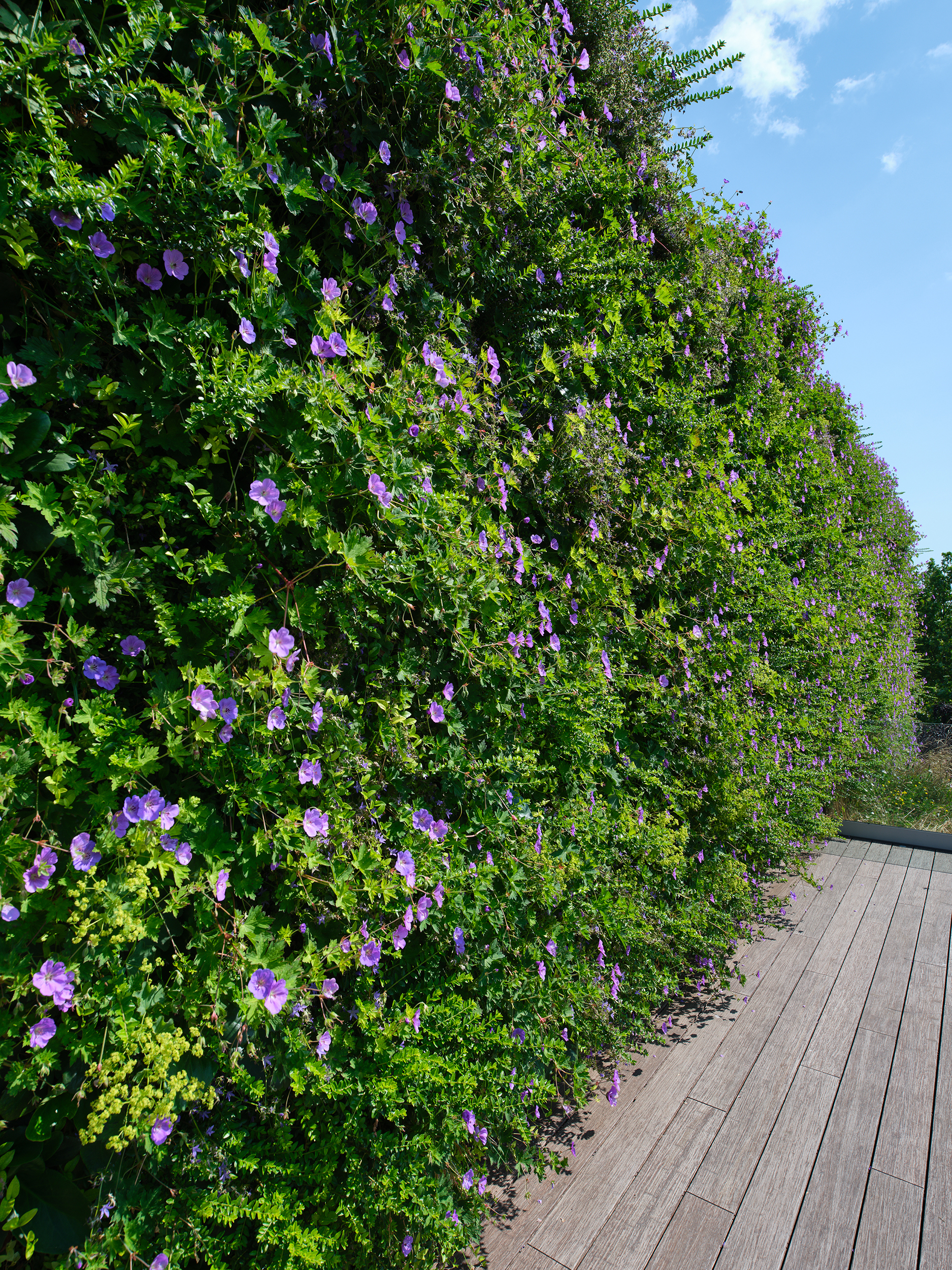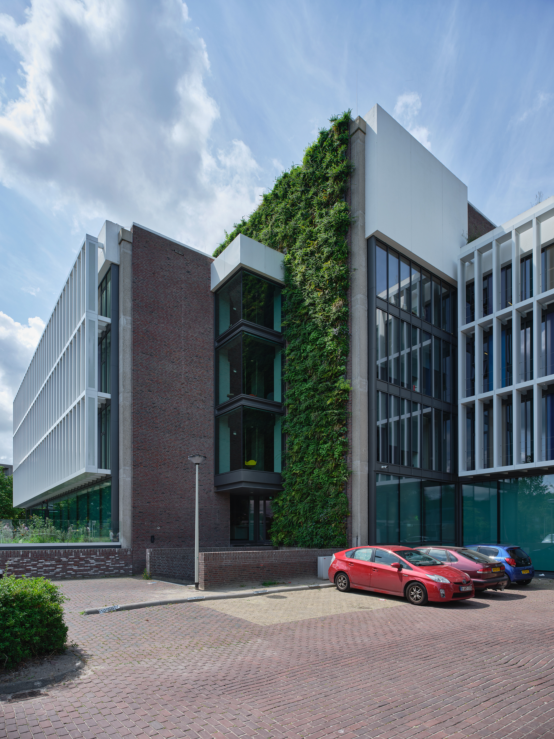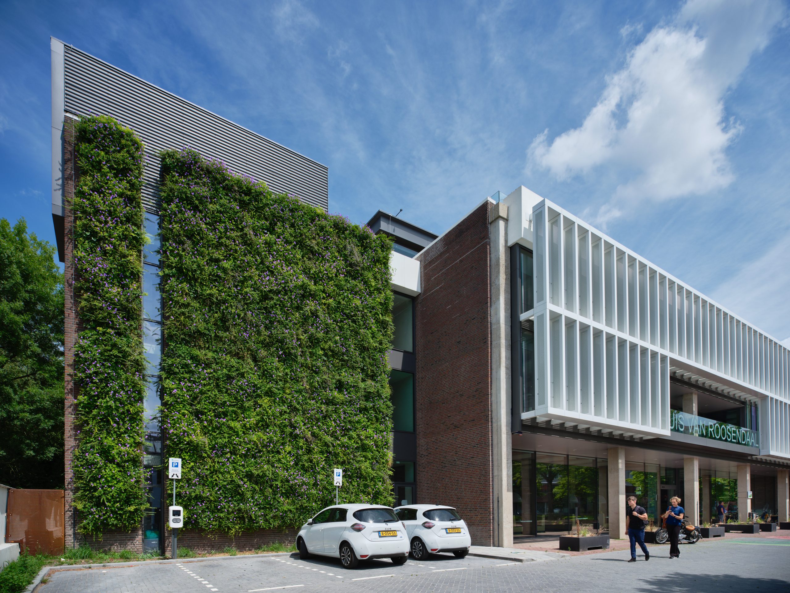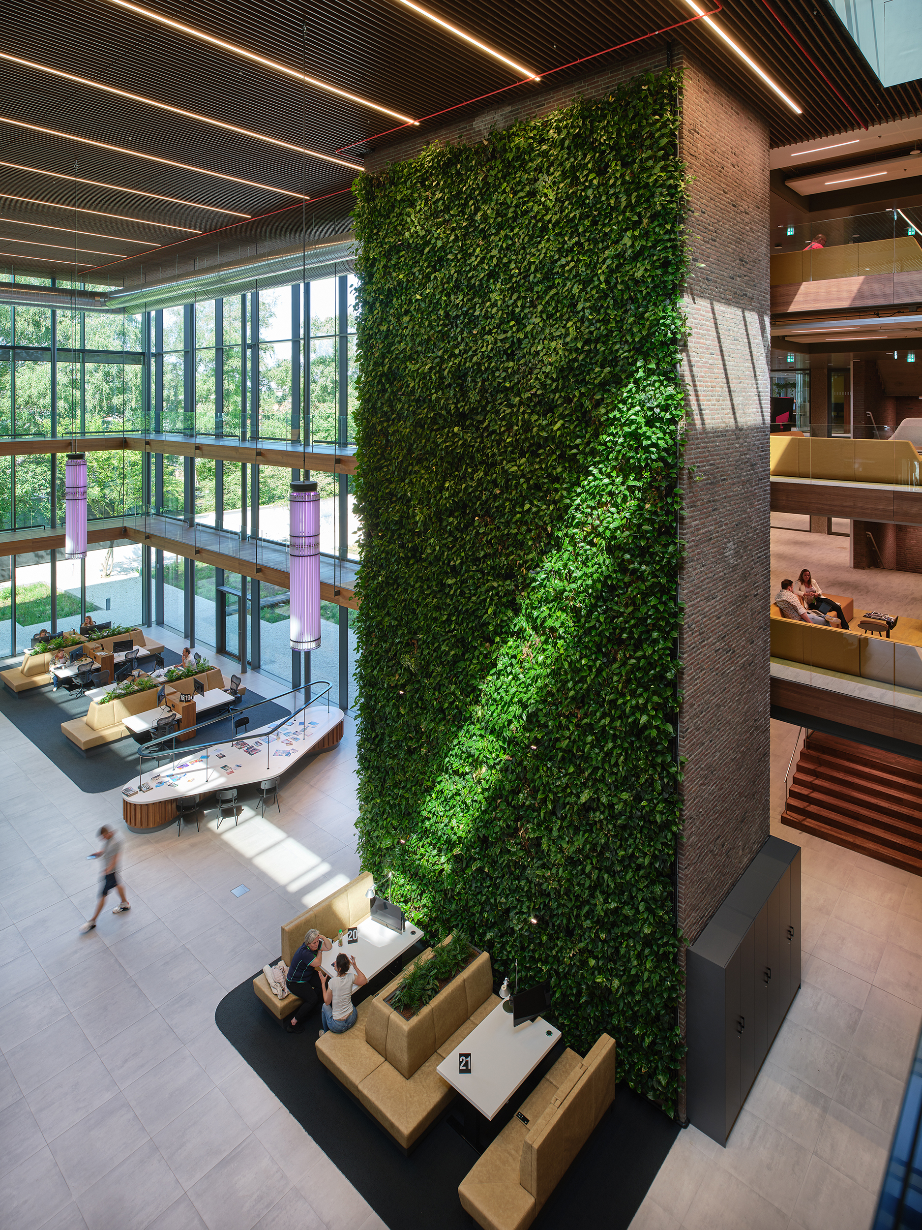 Een opvallend element is de 300 m² grote groene gevel, opgebouwd uit MobiPanel-systemen van Mobilane met verwisselbare plantencassettes, en een 50 m² LivePanel-wand in het atrium die zorgt voor luchtzuivering en akoestische demping.