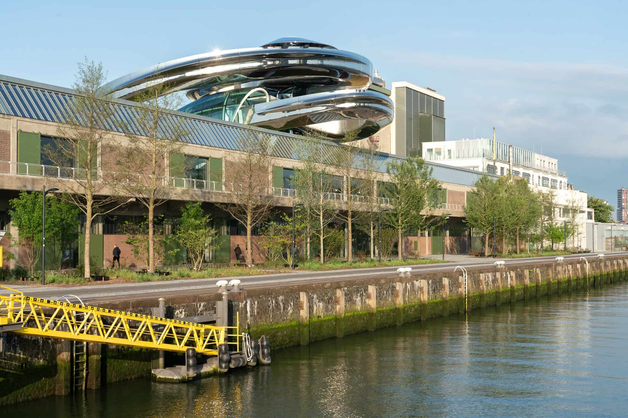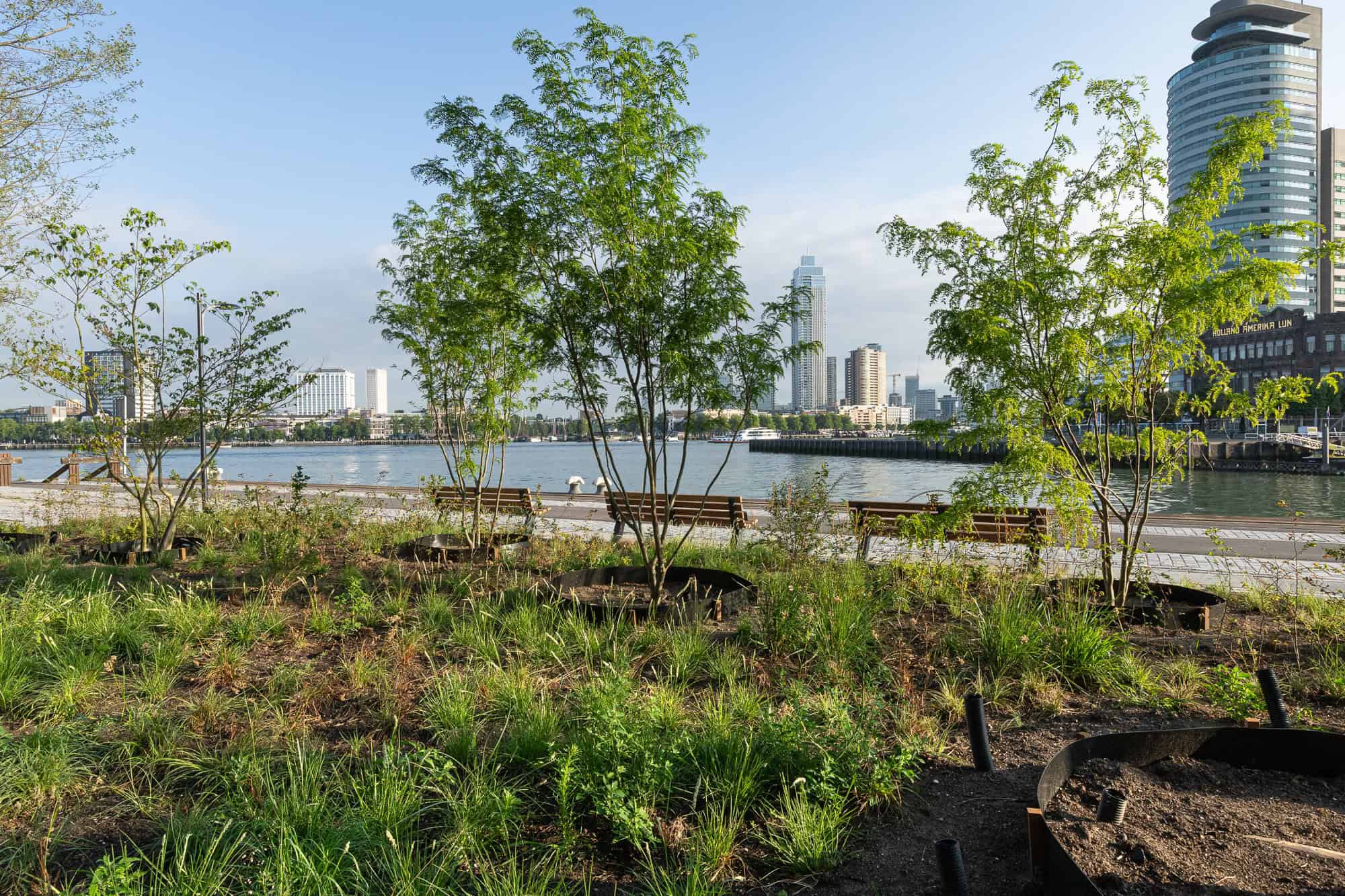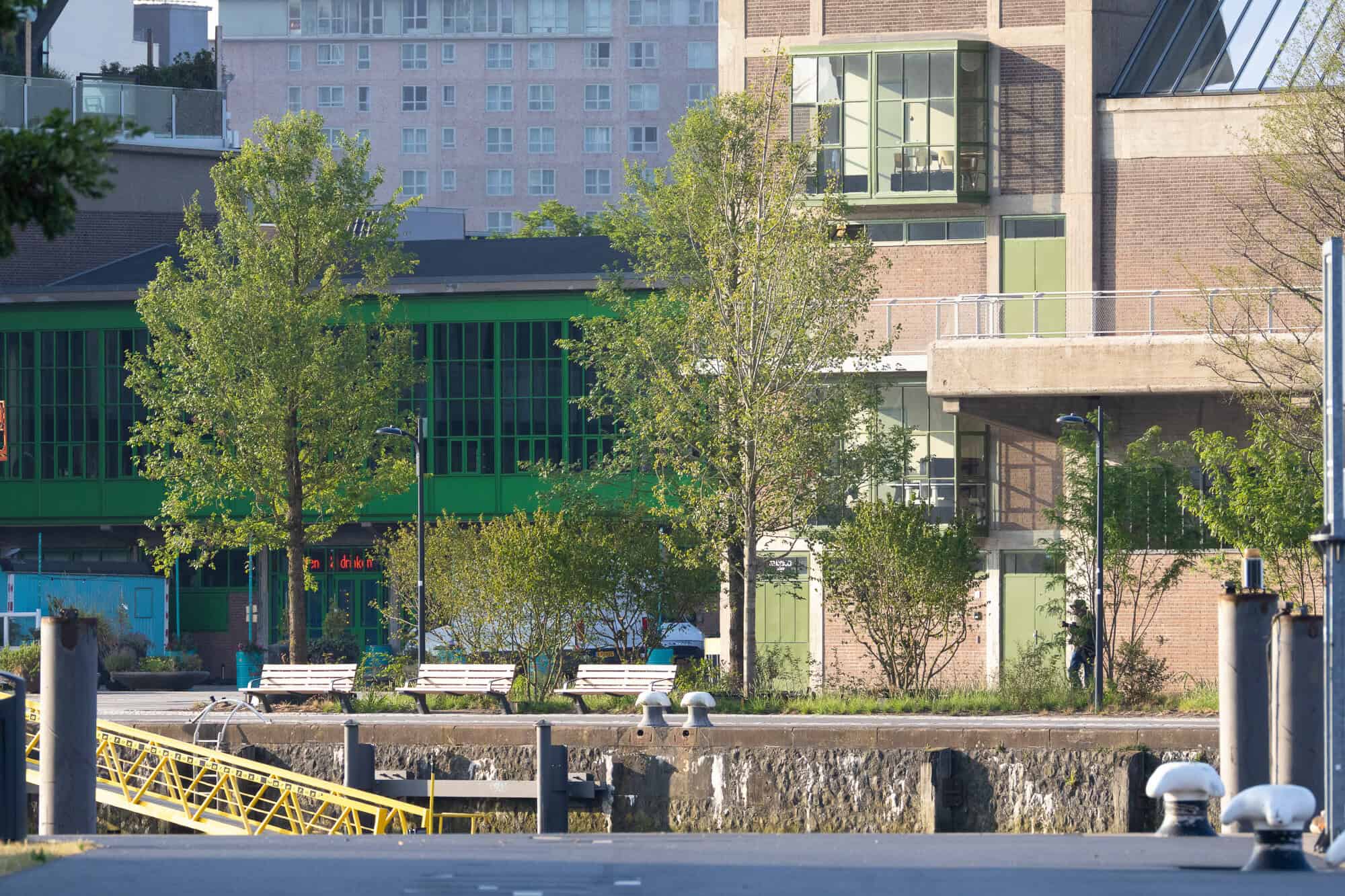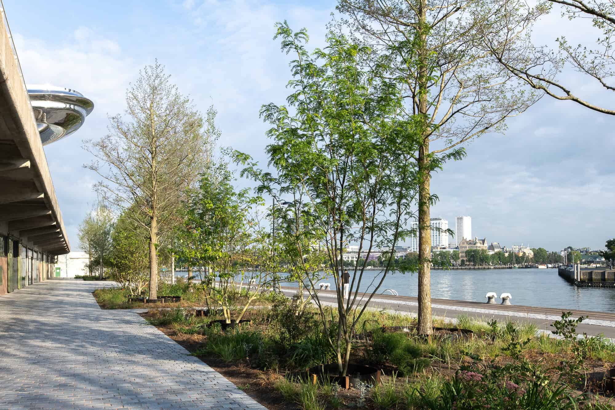 Op het dak van het gerenoveerde Fenix-pakhuis in Rotterdam is het grootste groendak van de stad aangelegd, met rondom het pand een divers beplantingsplan dat bomen, struiken, vaste planten en bloembollen combineert.